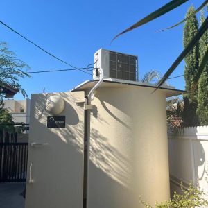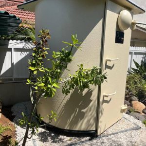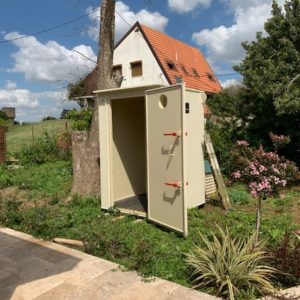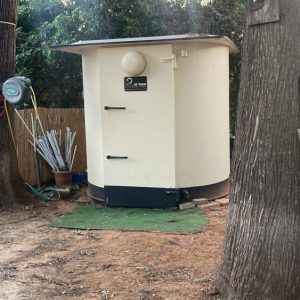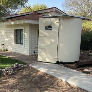 Silver round shelter next to a private residence
